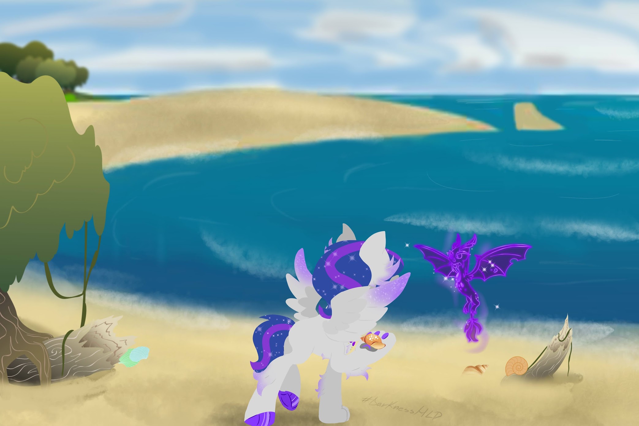 And this time I drew her along with Beelzebub on the edge of the forest on a small beach looking for shells to add to her collection. I do have to tell, Beel showed her a really cute little shell (the one in her paw). He usually just stands around and doesn't help her with this. But after all he couldn't let her all by herself to search around.